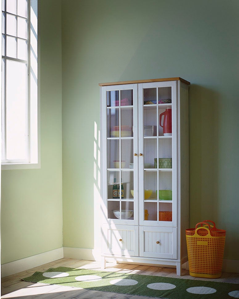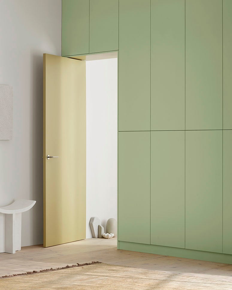Jotun Pistachio, 7386 (skåp), Fresh pasta, 1775 (dörr) och Reflektion, 1622 (vägg)