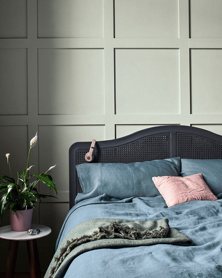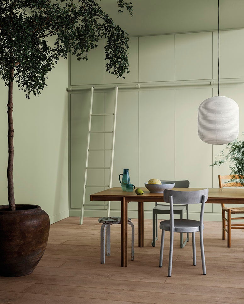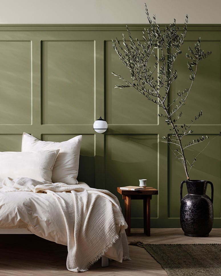 Jotun Green tea, 8493 (panel) och Sheer grey, 12077 (vägg)