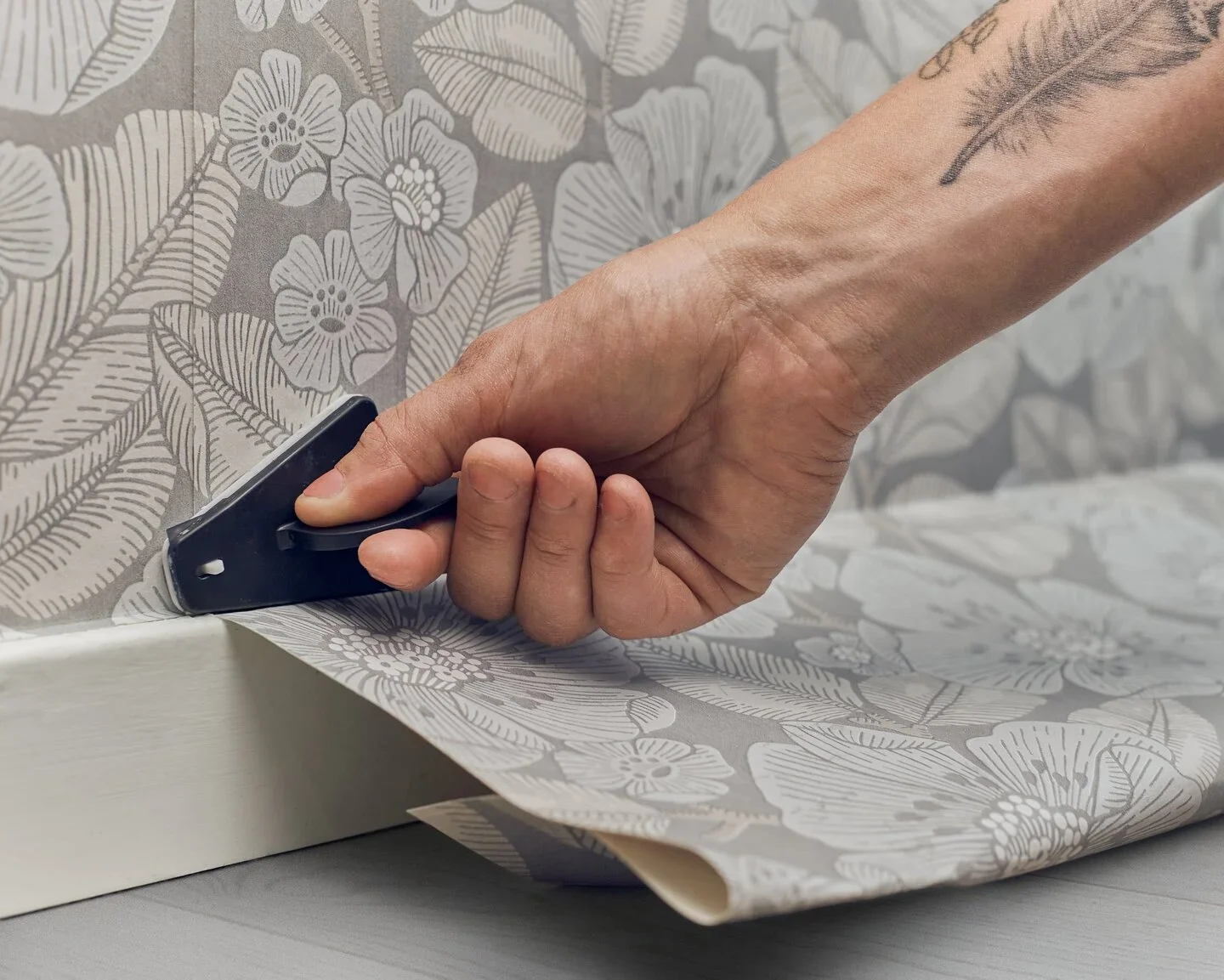 Arbeta vertikalt med tapetverktyget – stryk lätt vid kanten mot den limmade väggen för att undvika lim på verktyget.