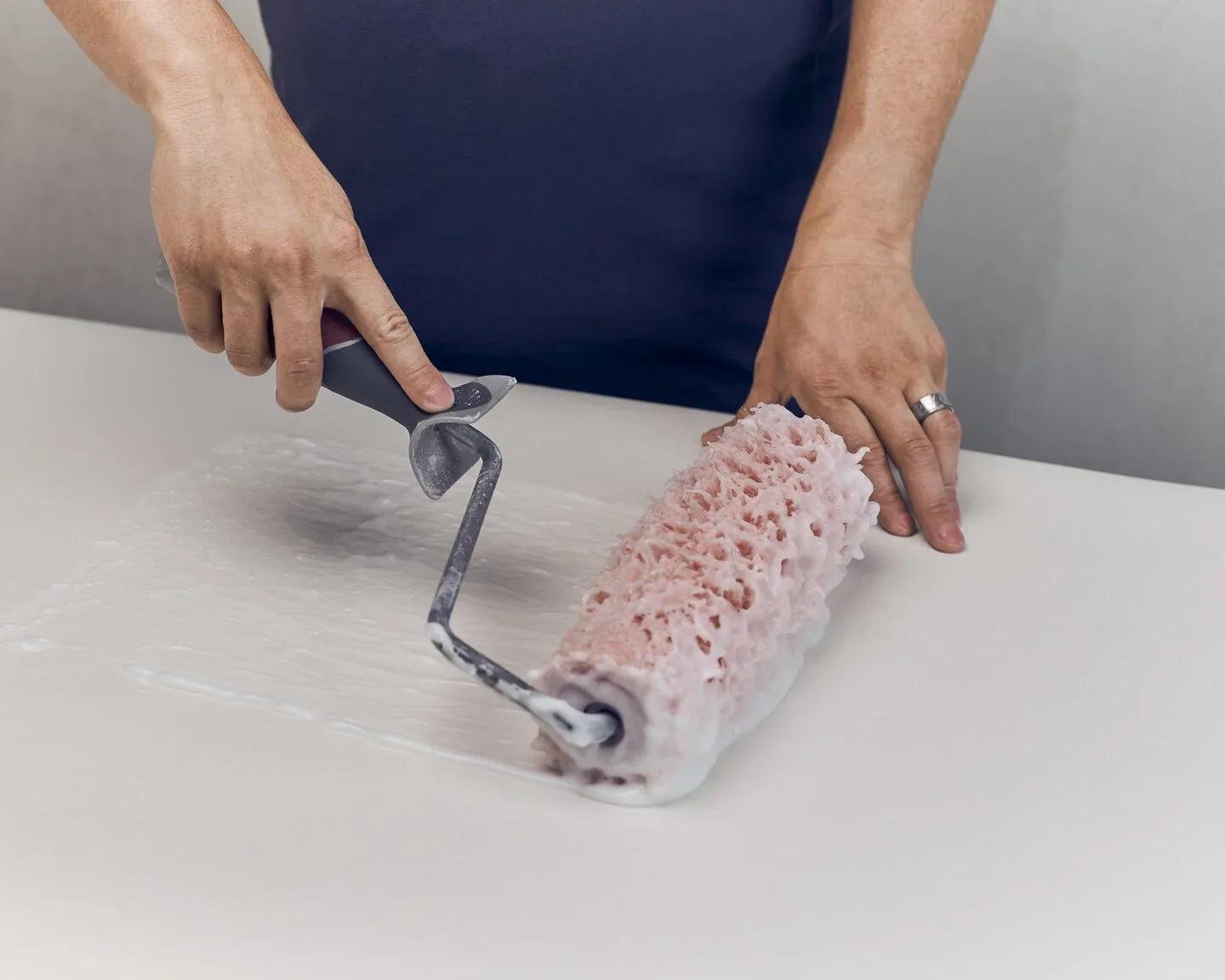 Rolla tapetlim på väggen, ca 2-3 våders bredd (1-1,5 m). Vid kanter och lister kan pensel användas.